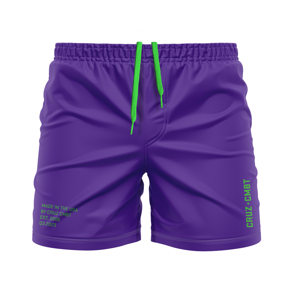 The Base Collection Men’s FC Shorts in Purple/Green by CRUZ CMBT are designed for No GI Brazilian Jiu-Jitsu, MMA, grappling, and high-performance training. Made in the USA from 90% polyester / 10% spandex, these shorts use antimicrobial, moisture-wicking fabrics to keep you cool and comfortable. Choose between training shorts with pockets or fight shorts without pockets, and select your preferred 3", 5", or 7" inseam. A Lycra gusset and 2" side split maximize mobility, while dye sublimated graphics ensure lasting color that won’t crack, fade, or peel. Finished with an elastic waistband and interior drawstring, these shorts deliver a secure fit and elite performance — only from CRUZ CMBT, the best place for combat sport gear.